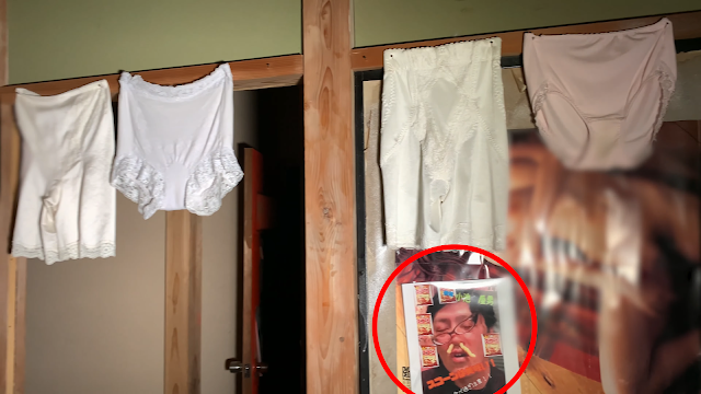 Oh! A bat in the closet. Even there, there are bats... They are really everywhere. This makes me think that... It would be nice to create a video game inspired by this place... The temple, the offices, the dojo, deciphering the posters, listening to the tapes, visualizing the VHS... It gives me plenty of ideas.By the way, thank you for reading my blog, which took me longer than expected.I don't know what's happening in this place, but the image quality of this video frightens me. The panties are dirty, and there are more and more of them; there are children's socks on the floor. Other explicit posters have been added. The ashtray has been cleaned and now contains only one cigarette butt.